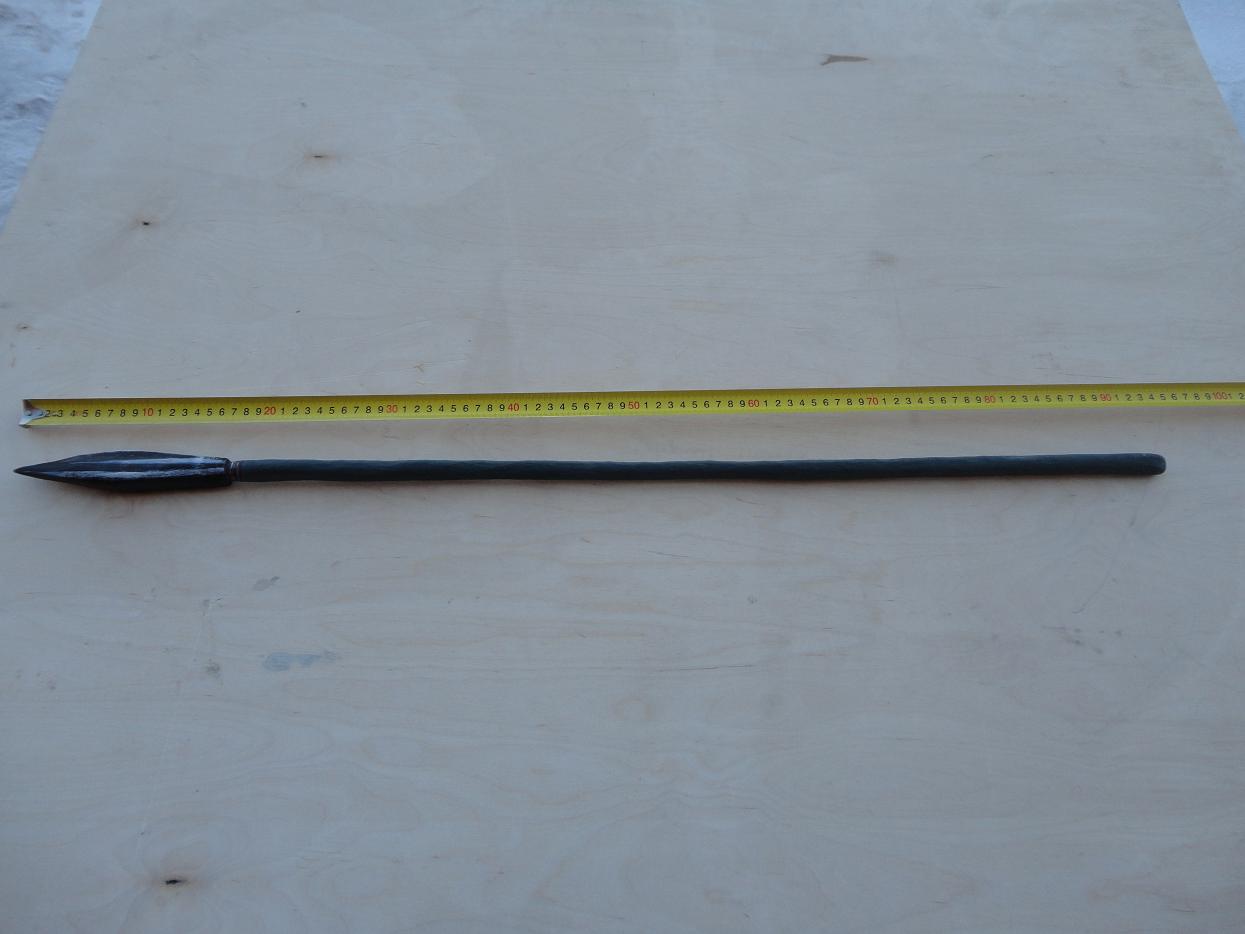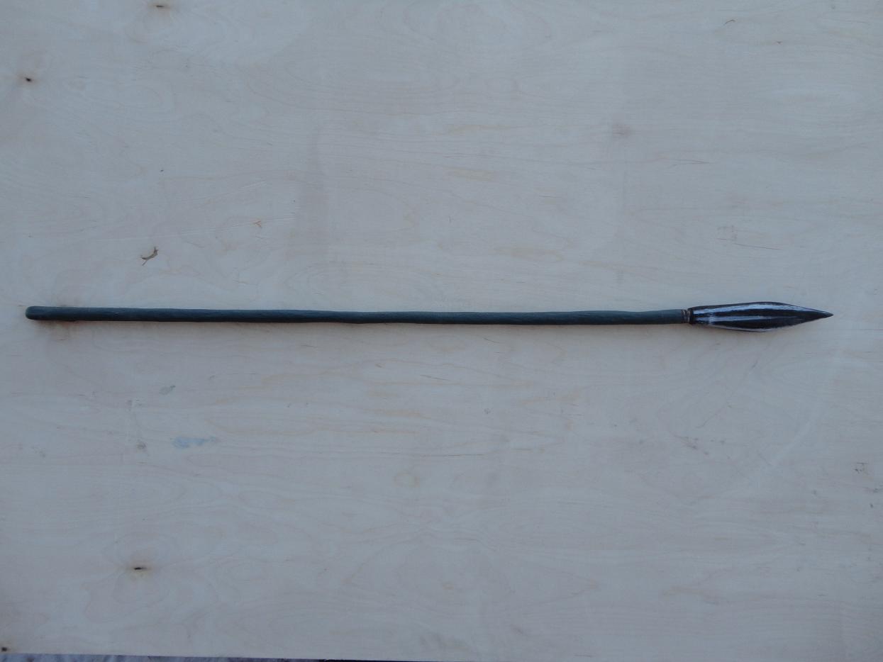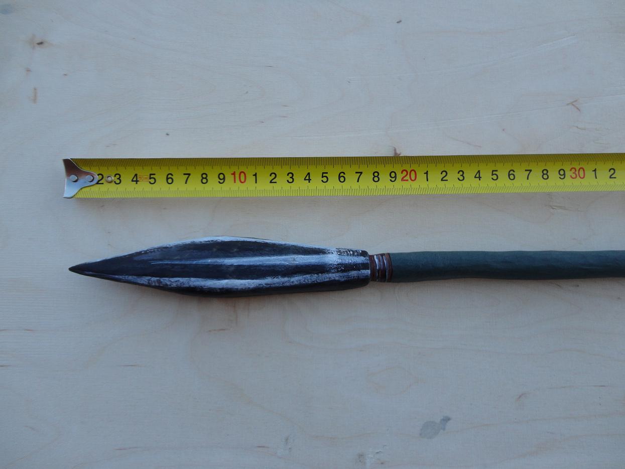 Серо-зелёный сланец.Вес камня: 0,6 кг.Толщина древка: 1,5-2 см.Габариты: длина дротика - 93 см., ширина наконечника - 3,7 см., длина наконечника - 16,7 см.