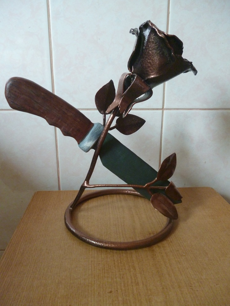 Зелёный сланецВес камня: 400 кг.Габариты: 25 см - длина ножа, 30см - высота композиции.