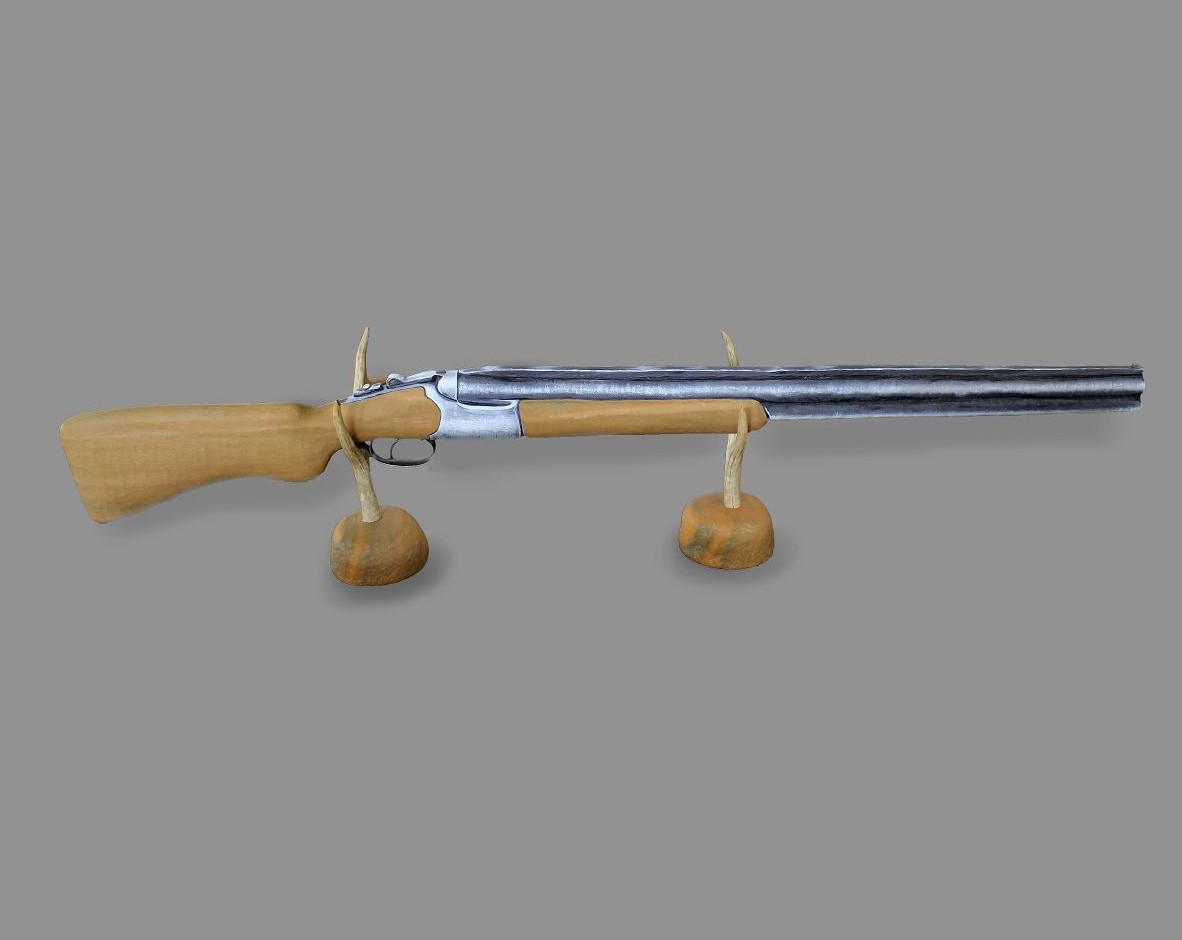 Прототип ТОЗ-34. Вырубленное из камня в натуральную величину ружьё. В качестве подставок использованы рога косули, заправленные в камень.